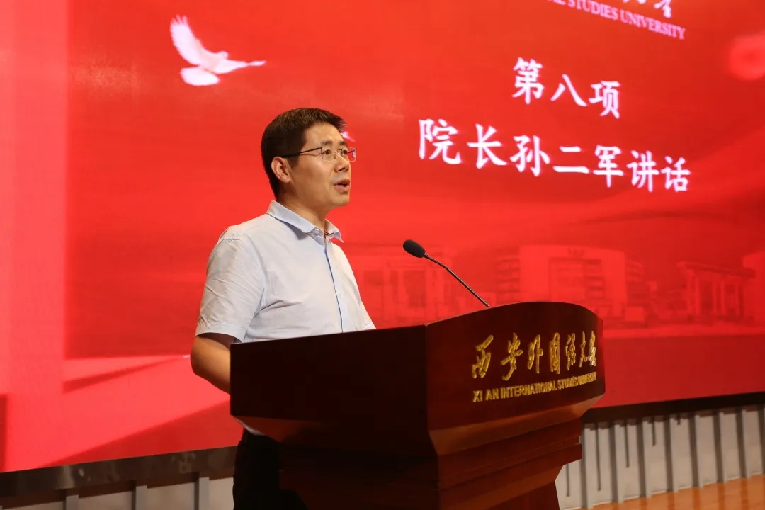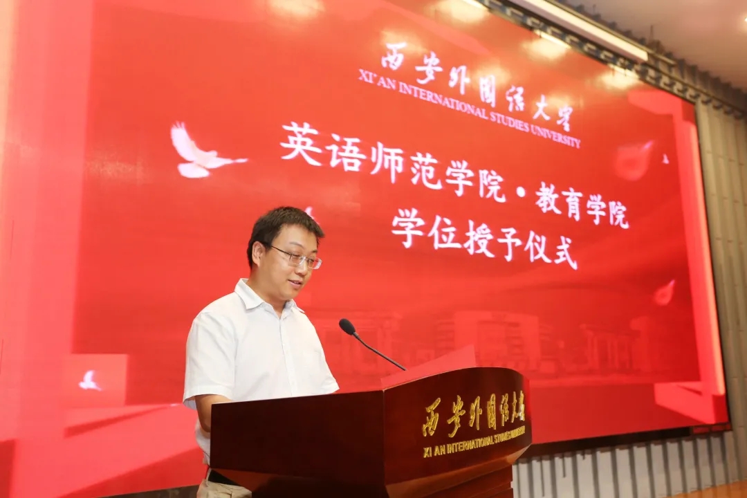 孙华教授代表学院全体老师为毕业生送上寄语,他希望毕业生们能够心地纯净,光明磊落;能够自由自在,保有一颗赤子之心。最后,他祝愿毕业生们好运常伴,迈向前程。希望同学们能够常回家看看,文苑南路6号永远是为西外学子敞开的家。