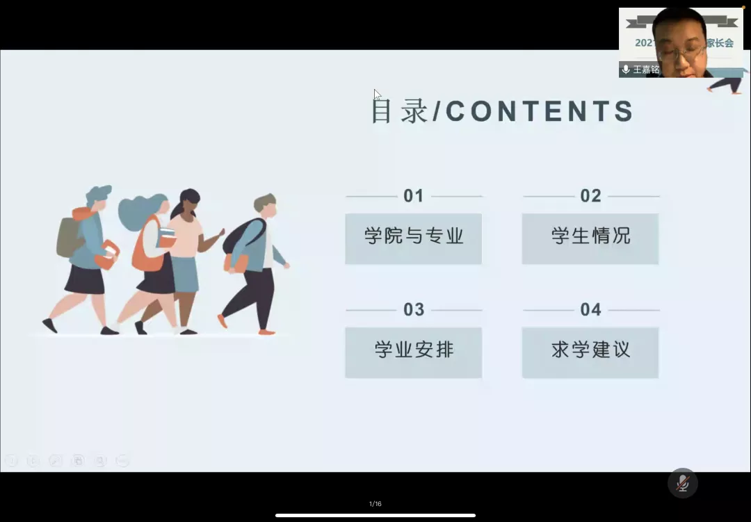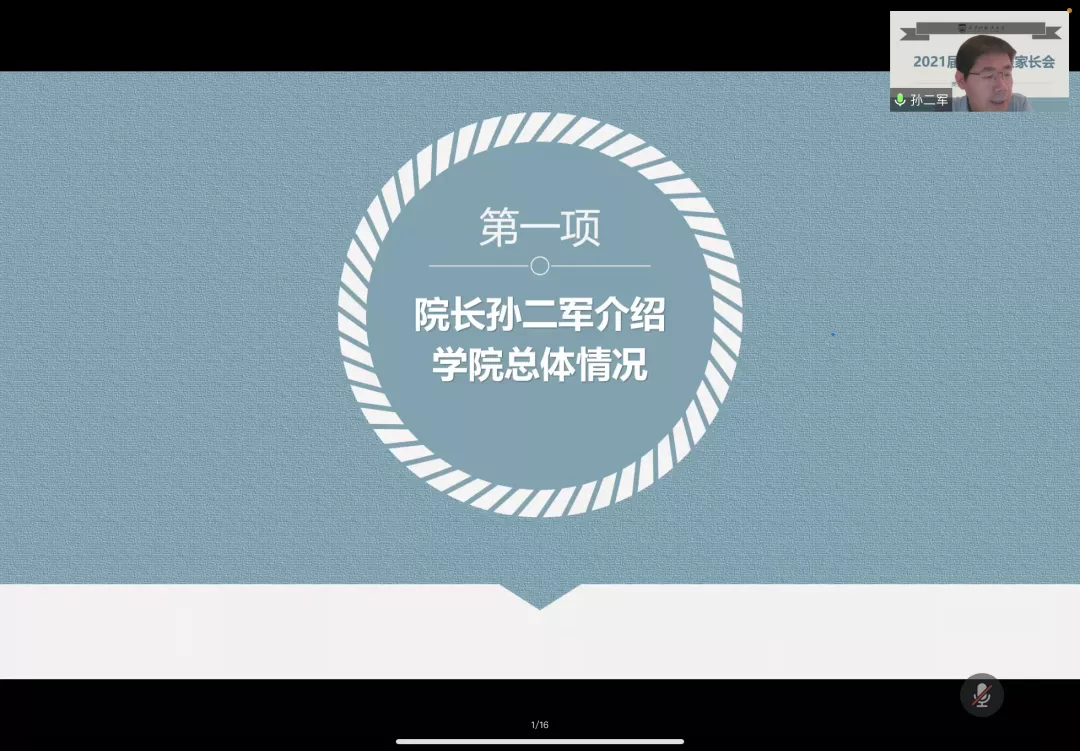 举办了2021级本科新生线上家长会。学院党委书记姚玮,院长孙二军,副院长王嘉铭、冯东出席了本次会议,2021级本科新生辅导员绪道恒、白蓉蓉以及学院2021级本科新生家长参会。会议由学院党委副书记刘一静主持。