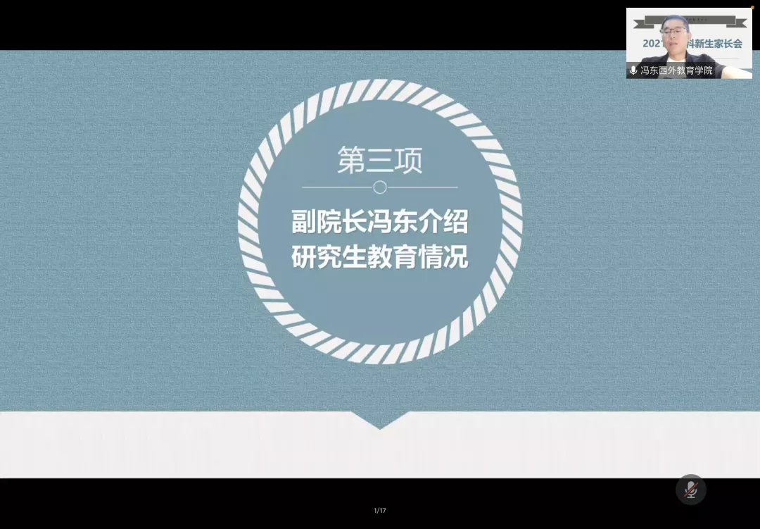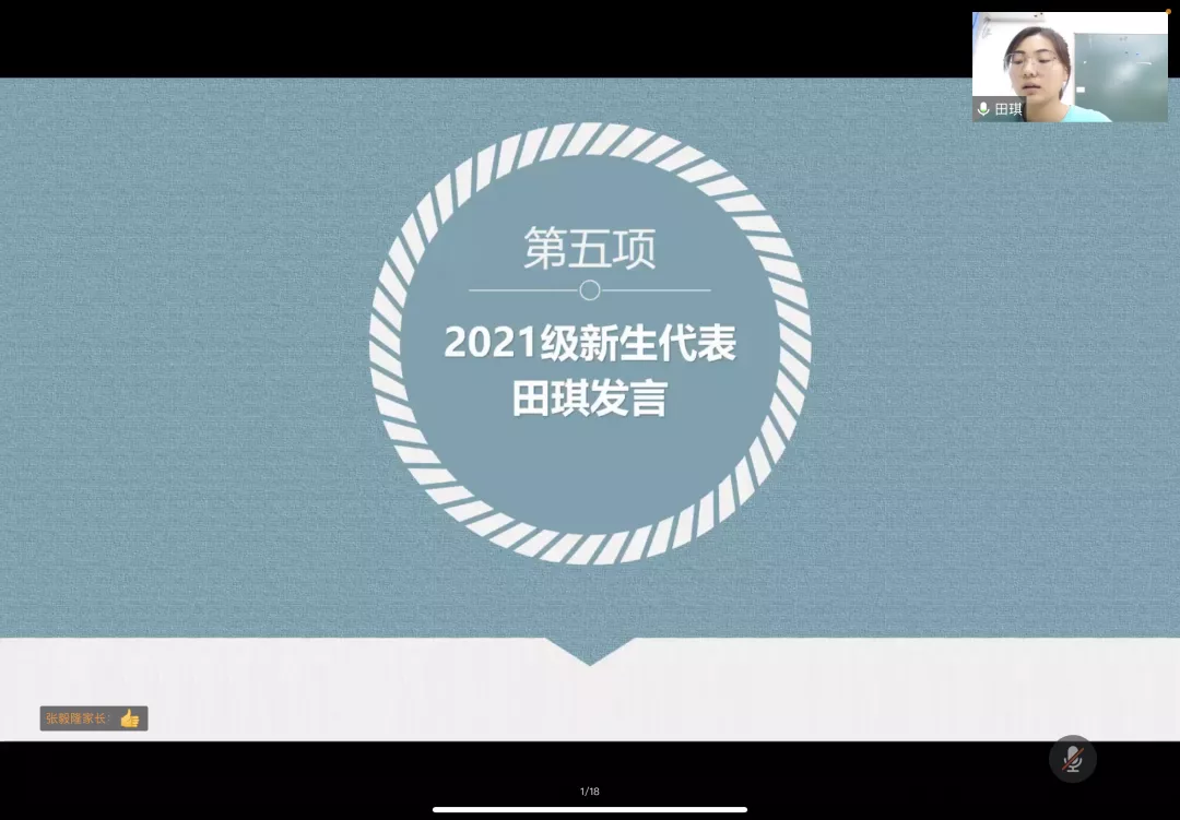 接着,王嘉铭重点介绍了学院专业设置及特色教育教学情况,并希望家长们能积极培养学生的自主能力,引导学生顺利完成学业,帮助其树立终生学习的概念。接下来,冯东全方位地向家长们介绍了学院本硕博一体化人才培养体系及英语师范专业的显著优势,并对2021级新生提出殷切嘱托,希望他们在未来的求学之路上认真学习,扎实走好每一步。绪道恒、白蓉蓉分别对新生入学报到、学校奖助贷政策、疫情防控要求以及新生安全教育做了详细说明,并提醒家长注意关注学生心理动态,与学校共同做好学生过渡期心理健康教育。随后,2021级新生代表田琪以及2017级优秀毕业生代表洪雅玲分别就开学感想以及大学四年求学感受做了分享。