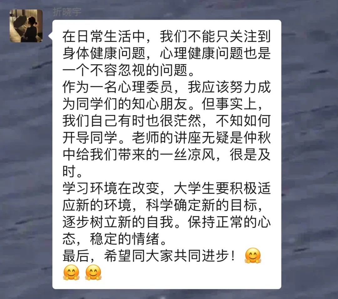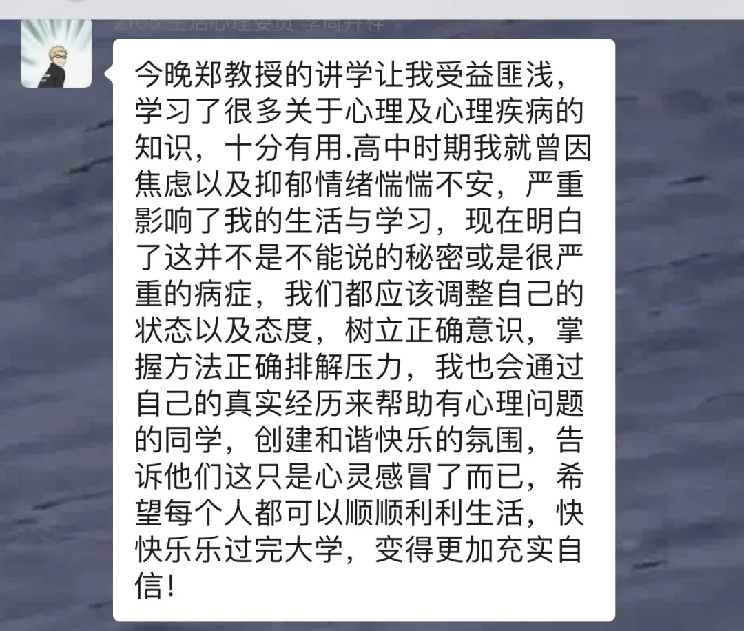 讲座结束后,2021级心理委员们纷纷表示课程内容丰富、干货满满,都大有收获,也对郑教授的精彩授课表示感谢。