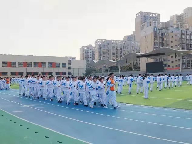 跑操终于开始了!阵阵响亮的有节奏的跑操音乐从广播里传出来,他们喊着节拍,字字铿锵有力,他们顺着节拍而动,双腿也自如地迈动起来,队伍慢慢地向前移动着。明媚的阳光,蓝色的跑道,映着同学们灿烂的笑容,此时的校园是最美的!