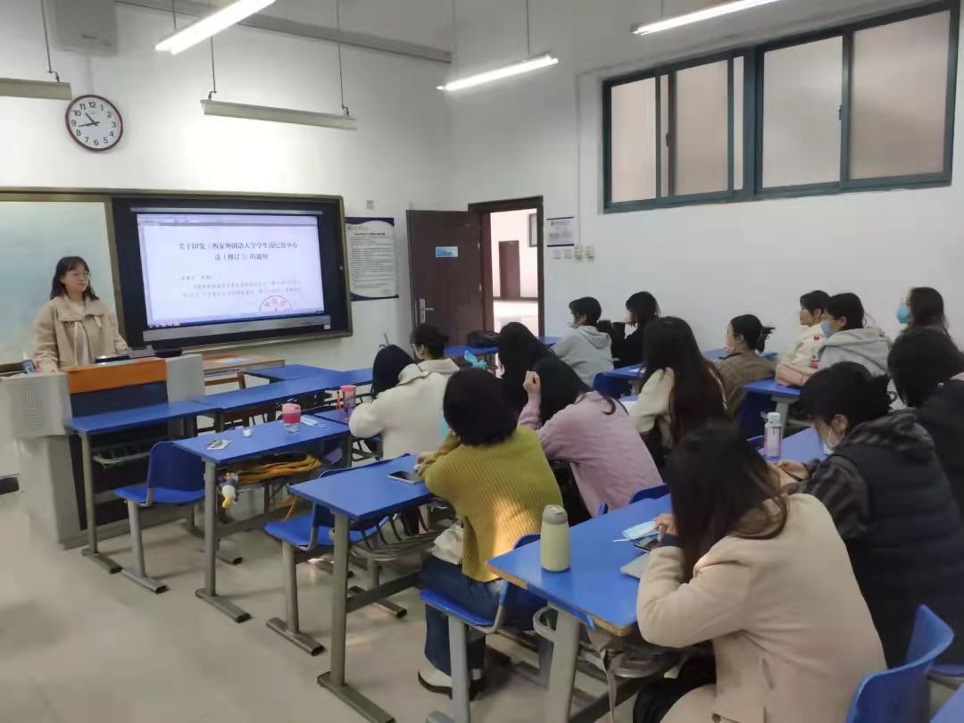 学生违纪处分办法(修订)》,介绍了违规违纪行为的处理措施,让同学们更一步熟悉了校规内容。