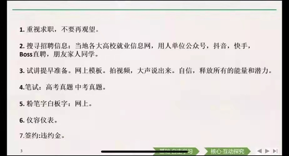 茶佳洁应聘至云南建水实验中学。她在分享中强调:对于找工作来说最重要的是要适合。每个同学的爱好和追求都是不一样的,不要盲目跟从同学们的选择。对于我来说,回家乡云南是比较合适的选择,所以我直接只投云南的简历。第二,立刻行动。没有任何工作会自动送上门,所以要主动出击。主动去寻找帮助,主动去搜寻招聘信息等等,行动起来才会有进展和收获。第三,做好充分的准备。机会是留给有准备的人的。如果应聘职位是教师的话,可以准备好简历,试讲,粉笔字白板字,教育教学的相关知识,还可以准备适合的面试服装,学会化适合的妆容等等。最后,要对自己有信心,淋漓尽致的释放自己所有的能量和潜力。不要妄自菲薄,其实每一个人都有自己的优点和潜力。有勇气,有信心,一定会有所收获的!