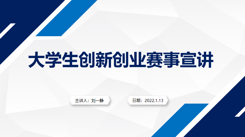 宣讲会上,刘一静首先对大学生创新创业赛事进行简介,分别从“什么是双创、具体赛事简介、我校参赛情况、鸭奈飞