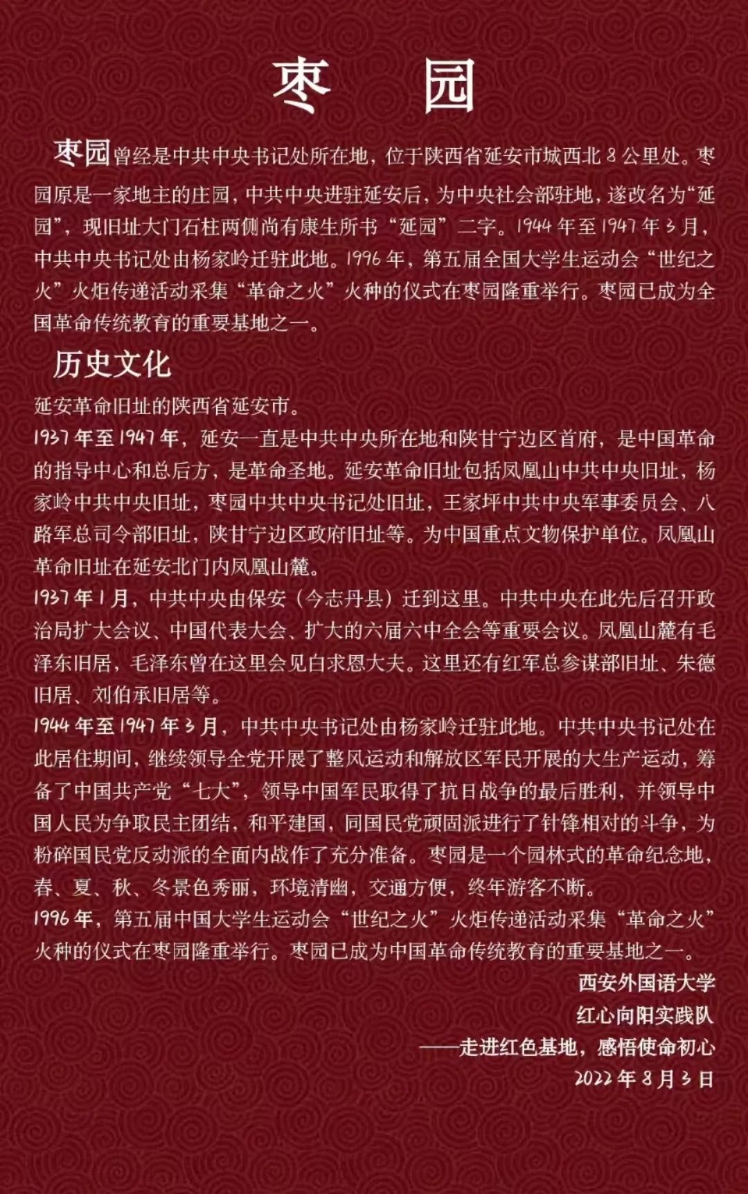 “红心向阳--党史学习教育团”在枣园革命旧址开展了红色景点调研活动。并且调查民众对红色旅游的看法并总结,走向社区面向群众宣讲。