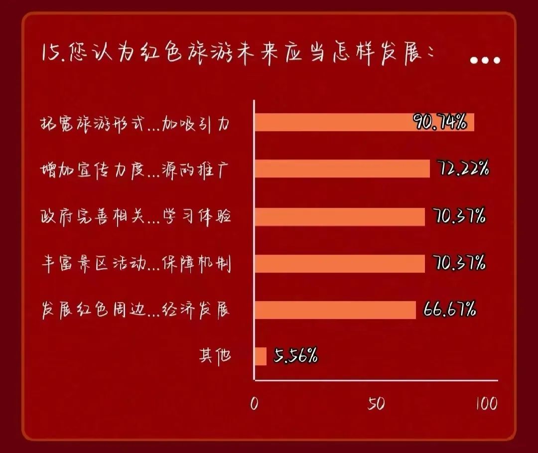 (1)拓宽旅游形式。在展览馆、纪念馆的基础上,采取灵活多样的创新形式,增加吸引力;政府加大资金投入完善相关基础设施建设,提高游客游玩、学习体验;丰富景区活动,对景区进行合理规划,完善景区安全保障机制;发展红色周边产品,推动当地第三产业发展,带动经济发展;