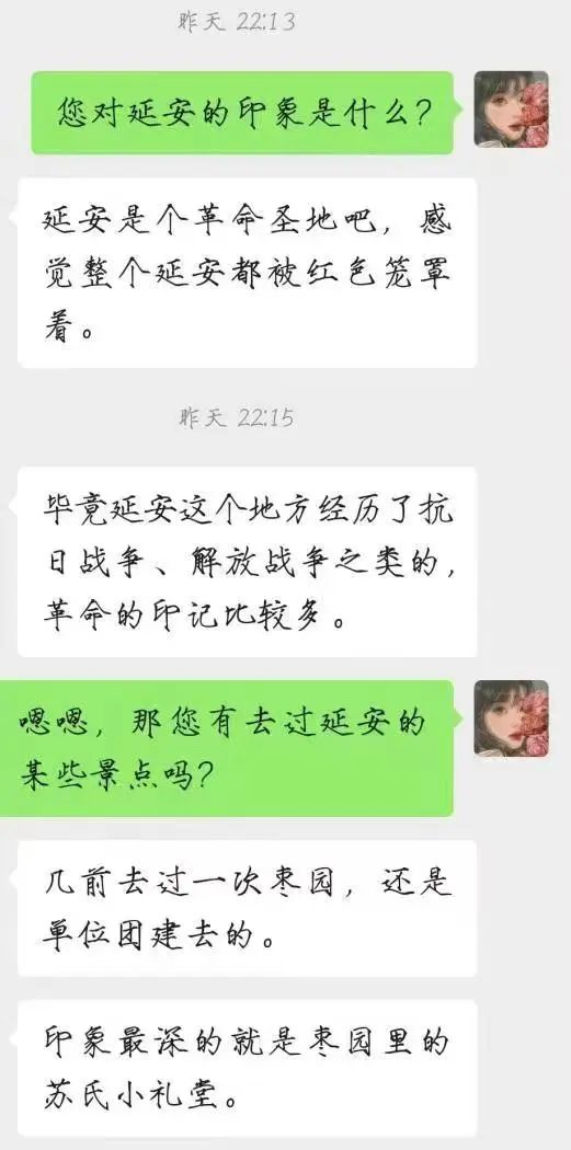 实践队成员通过线上及线下对一位西安市民及一位外地游客分别进行了访谈,通过访谈,队员们了解到了国内其他地区对延安市的印象以及对延安市红色党史宣传的看法及建议。