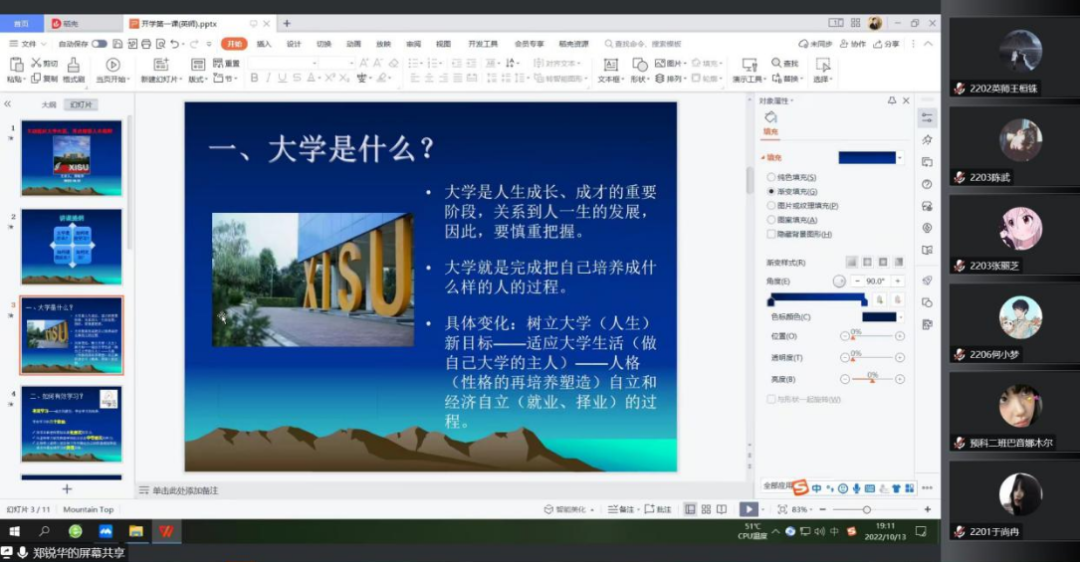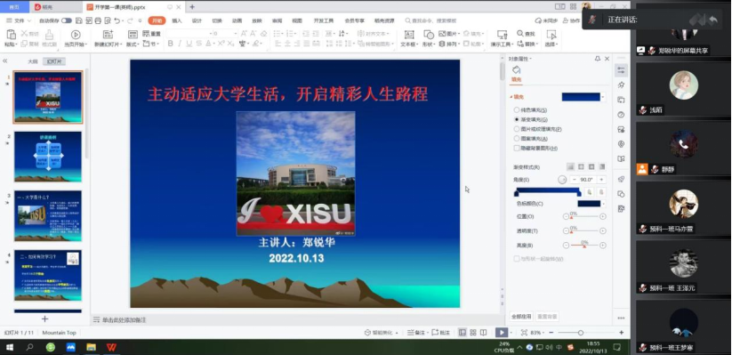 于2022年10月13日开展了2022级新生入学教育系列讲座——新生适应专题。很荣幸邀请到了校党委委员、校党委统战部部长郑锐华老师来为2022级新生进行此次线上讲座,鸭奈飞