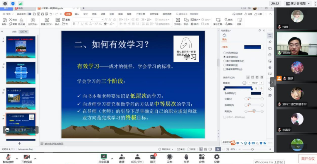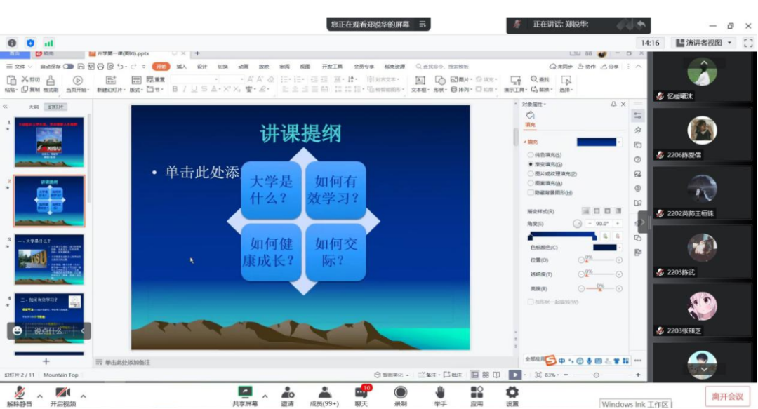 在最后,郑锐华老师为我们讲述了“三个离不开”“五个认同”,让同学们对于加入我们英语师范学院大家庭充满了自豪与欣喜。郑老师恰逢其时给我们上了一堂非常有意义的爱国主义教育课程,这样的一个爱国以及学习主题的教育让所有学生在云端都受益匪浅。
