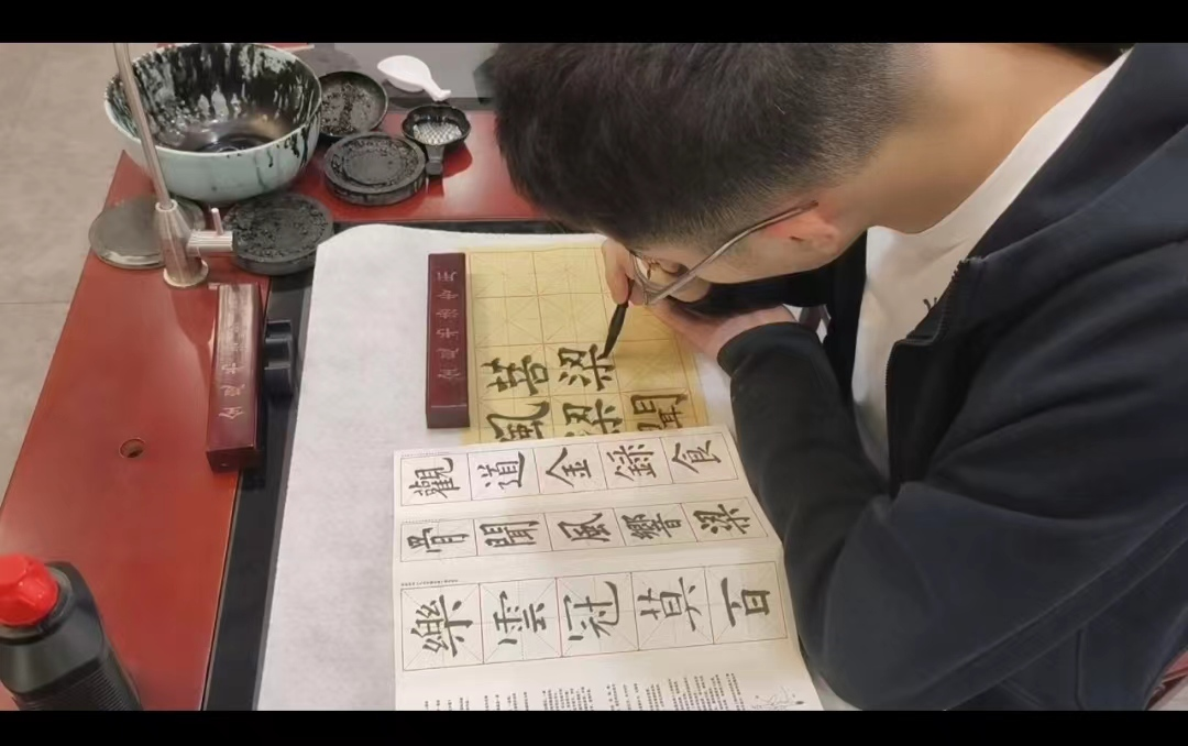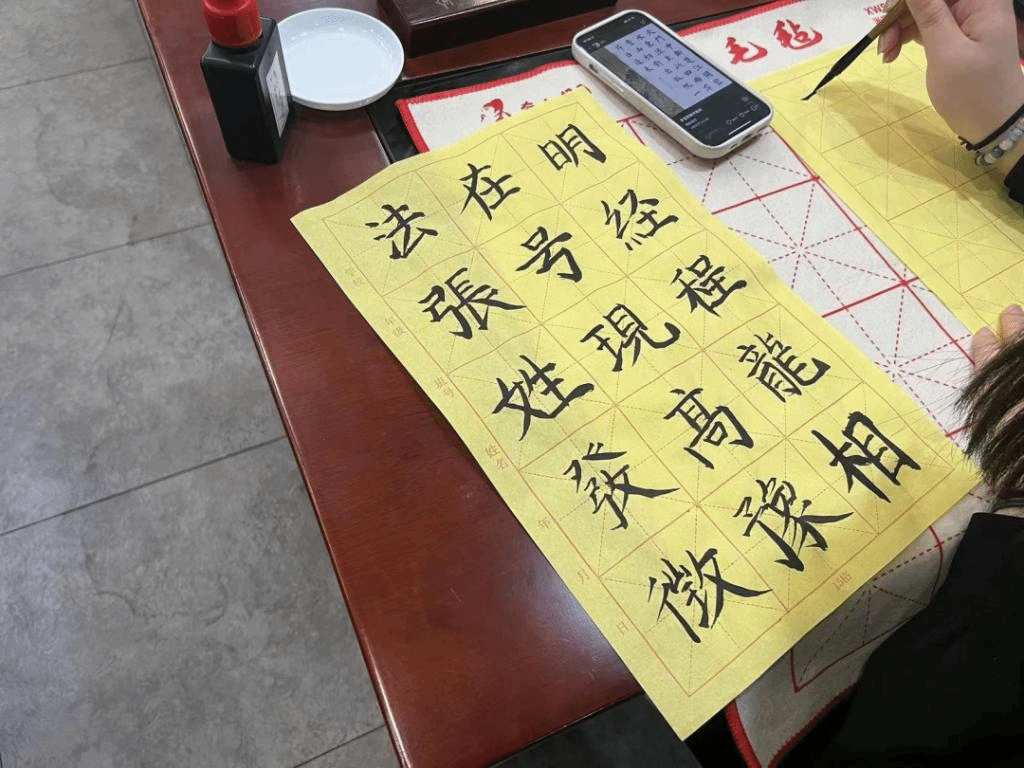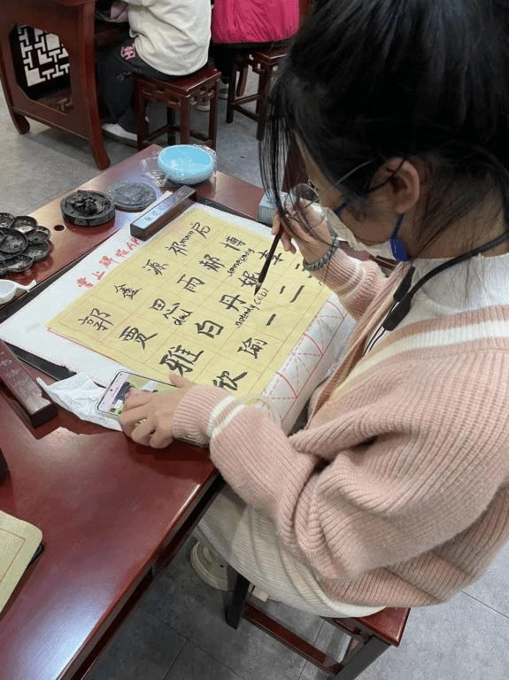 课堂上,张欣老师深入浅出地向同学们讲解了文房四宝的分类及制作工艺,加深了同学们对文房四宝的认知,然后张老师从握笔、运笔及排版三个方面向大家讲解了汉字书写的小技巧,着重强调正确的运笔方法。为了让同学们进一步知道如何规范书写汉字,他现场泼墨,边讲解边书写以做示范,向同学们直观地展示书法的魅力。在书法练习课上,同学们将理论付诸实践,积极练习、规范书写,练就扎实的书法基本功。