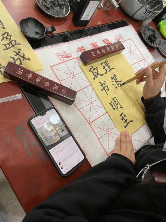 西安美术学院张欣老师向同学们阐述了书法课的定位和课程理念,通过展示自己的书法作品和书法对个人素养的正向引导,极大地增强了学生的学习热情,在展示过程中张老师提出了具体注意事项和材料购买技巧,加深了学生对书法课的了解。