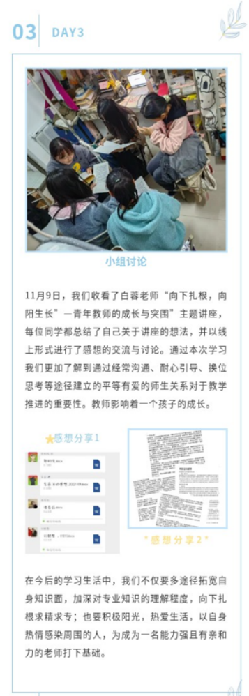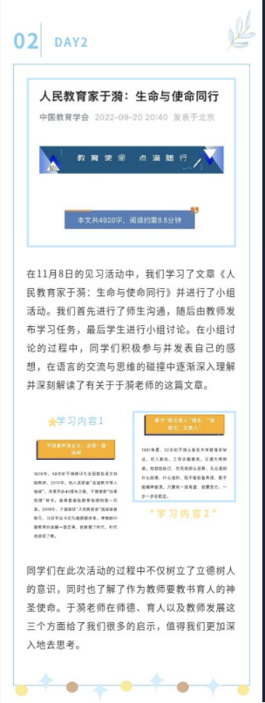 本次实践周活动的顺利开展离不开学校统筹布局、学院科学规划、资深教师无私分享和指导老师们悉心指导,而所有同学们的努力认真和积极参与,也是保质保量完成教育见习任务的关键。本次实践周工作圆满完成,广大师生都获益良多,每个人必将在各自的岗位和角色中重新认识自我,明确奋斗目标,为实现人生价值和促进全面发展踔厉前行。