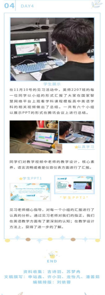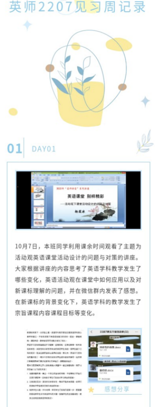 除了以上线上专题讲座外,英师大一教育见习的8位带班老师们还组织同学们围绕线上讲座和教学案例等内容开展了线上或线下的各班实践活动。例如吴淑芳老师带领英师2201班学生结合线上讲座,开展了围绕新课标英语学科教学、学业发展与规划、专业学习与个人成长等内容的学习心得分享会,并对个人学业规划、未来职业和专业发展进行了积极展望。张梦佳老师在英师2206班级见习活动中给同学们首先讲解和区别了师范专业必经的三个“习”(实习、见习、研习),介绍因疫情原因调整为校内见习的实践活动安排,并对考勤等实践周要求进行明确要求;师生通过观看专业英语教师对高中英语课堂的教学视频,学习一线教师的英语教授经验,组织分享探讨优秀教师的优良品质,从而反思自己的专业学习和未来职业规划;除此之外,张老师还分享了自己的求学经历及教学经验,并指导学生学习普通高中英语课程标准,对同学们提出的疑问进行答疑解惑。周恬老师组织带领英师2207班同学按照学院实践周安排,有序开展教育见习活动,坚持每天在班级微信群里进行师生学习交流,针对学生反馈问题进行及时答疑解惑;同时根据学习内容,发布小组学习任务,如在观看完国家智慧网络平台上的高中英语学科授课视频后,周老师组织学生以小组PPT形式进行腾讯会议线上展示,从教学设计、核心素养、语言流畅和仪容仪表等方面进行了小组汇报分享,学生们还将见习活动内容进行编辑汇总,图文并茂地呈现出来,反映出大家积极参与教育见习的高涨热情和积极态度。