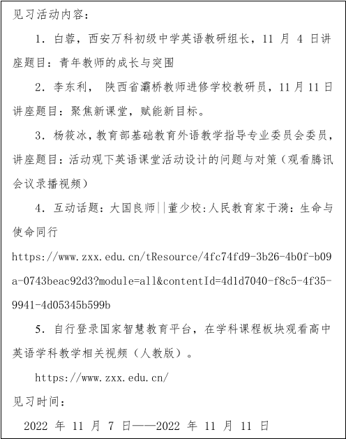 学院为英师2022级本科一年级学生安排组织了内容丰富的教育见习活动,线上活动主要包括三场专题讲座、一位教育名家事迹案例、一系列高中英语学科教学视频观摩等;线下则由各位负责教师带领学生在教室开展主题讨论、教学案例分析、学习心得分享等活动。