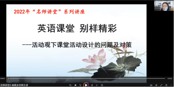 第二场讲座主讲人是教育部基础教育外语教学指导专业委员会委员杨筱冰老师。她围绕“活动观下英语课堂活动设计的问题与对策”进行了主题讲座。杨老师从课程宗旨、课程目标、课程结构、课程内容和教学途径等方面分析了新课标背景下英语学科教学的新变化,提出英语活动观视域下开展英语教学的实践策略;同时她还以新教材的具体章节为文本,进行课堂设计和案例分享。除此之外,杨老师也针对目前英语学科教学中存在的问题,提出有针对性的改进思路和实践路径。杨老师的讲座从宏观视角分析了新形势下英语学科教学的新趋势与新挑战,并以科学理论结合教学实践进行案例分析,内容丰富,深入浅出,使同学们对英语教育有了全方位、多视角和新思路的了解与学习,为今后职业发展提供了科学指导,同时广大英语教师也获益良多。