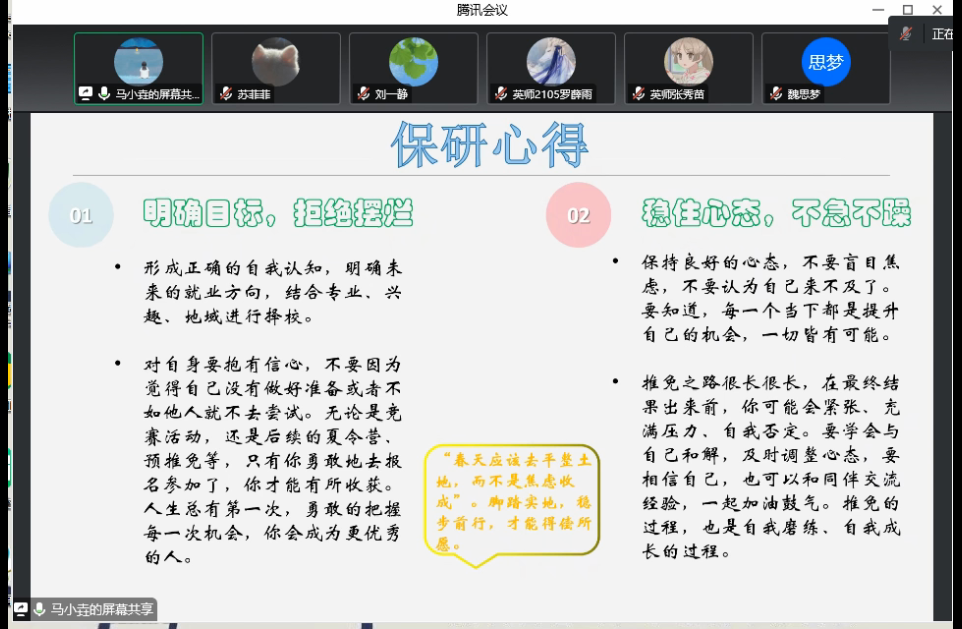 第二部分是保研心得篇。马小垚为大家分享了她的三点经验:一,明确目标,拒绝摆烂;二,稳住心态,不急不躁;三,面试要礼貌、自信、专注。