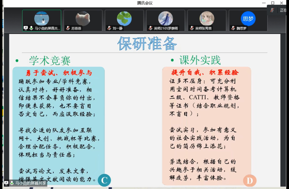 最后是感想与问题解答部分。马小垚为大家送上了美好的祝愿:星光不问赶路人,时光不负有心人。预祝大家在毕业之际都能收获到自己满意的下一站车票。随后,她也对同学们关于保研规划等问题做出了耐心解答。
