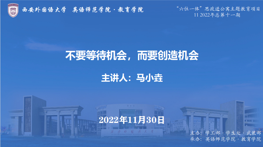 2019级英语(师范类)专业本科生马小垚,她的分享会主题为“不要等待机会,而要创造机会”。学院党委副书记刘一静和学院各年级学生参加了分享会,本次分享会由苏菲菲主持。