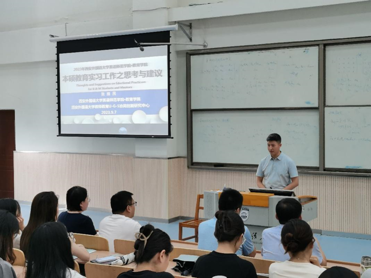 大会第二项,张维民老师介绍了实习的要点和要求。他首先提出了关于教育实习要搞清楚的几个问题,包括身份认同、什么是实习以及如何达到实习目的。张老师提到师范专业的教育实习是一门必修课程和必需实践环节。教育实习是专业实践反思。他强调了反思性实践的重要性,让同学们在实习过程中不断反思自己的实践经验,并详细介绍了如何做好班级管理实习工作和调查研究实习工作。“纸上得来终觉浅,绝知此事要躬行”,张维民老师给大家提出了真切的建议和祝福。