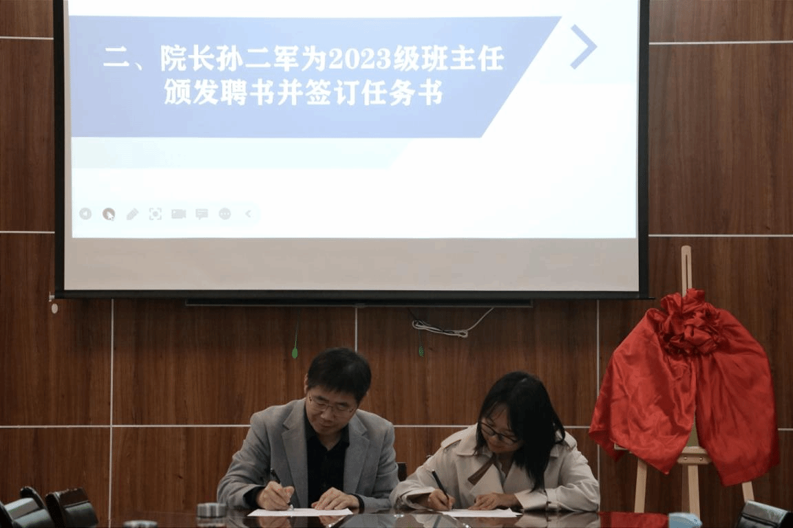 随后,孙二军院长为2023级班主任颁发聘书并签订任务书。孙院长讲到,“师者,所以传道受业解惑也。”作为教育者,不仅要有渊博的学识,更要有为人师表的责任意识,在品德和行为方面为学生树立榜样。