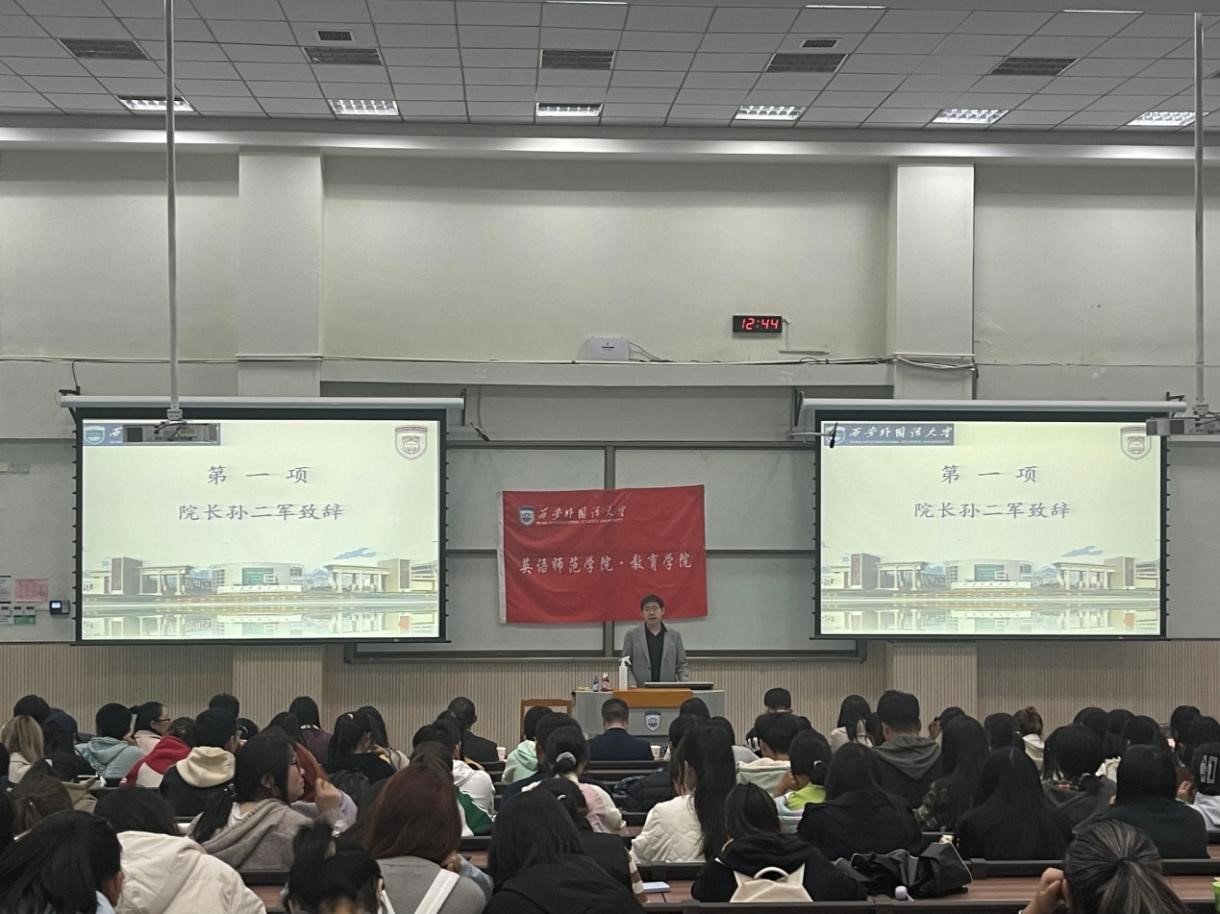 院长孙二军、党委书记姚玮、党委副书记刘一静、副院长冯东、研究生辅导员薛璐、2023级本科生辅导员鹿国鹏,2023级本科生班主任樊莲花、惠瑜、裴丽,研究生“小先生”51人以及2023级全体本科生出席仪式。仪式由2023级研究生辅导员王鑫主持。