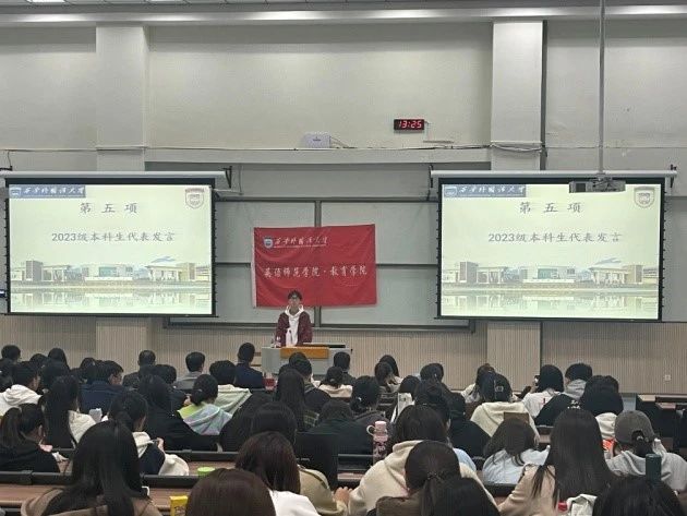 仪式第五项,2023级本科生代表高尔默同学上台发言,他认为 “小先生”制的实施为研究生和本科生之间的沟通学习搭建了桥梁,为更好地促进同学们学习与进步、丰富校园文化生活提供了有力保障。