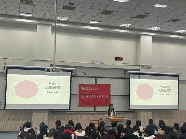 仪式第二项,由优秀“小先生”代表进行经验分享。2022级优秀“小先生”代表杨冰燕和杨海韵依次上台作经验分享交流,她们结合自身经验,提出“小先生”应扎实推进学业指导,做好长期规划,指导本科生积极参各类实践活动,为本科生进行职业生涯规划指导。