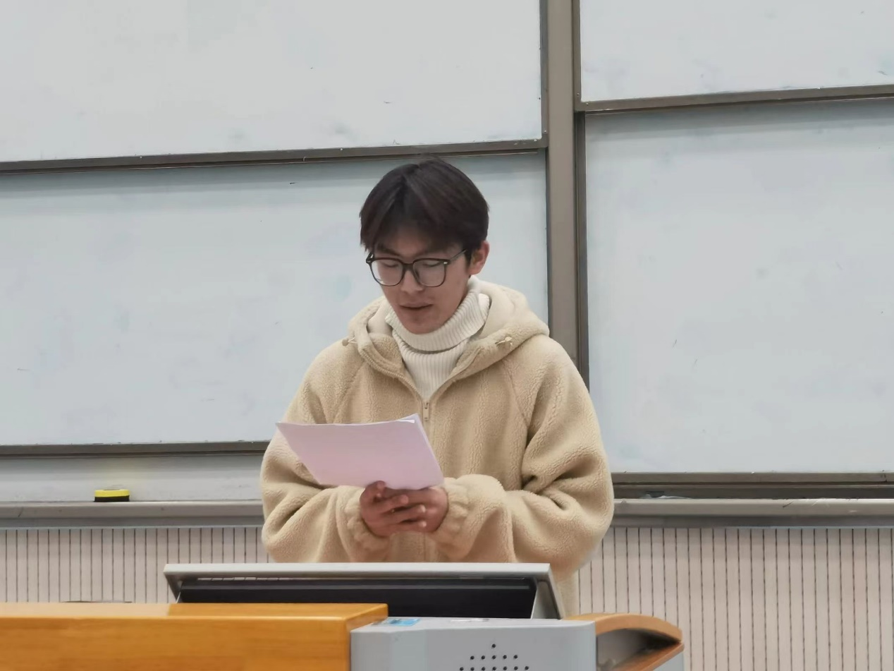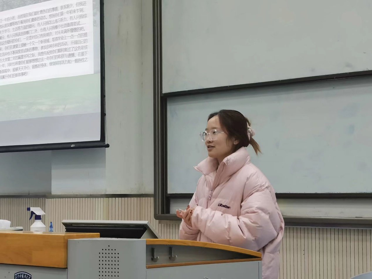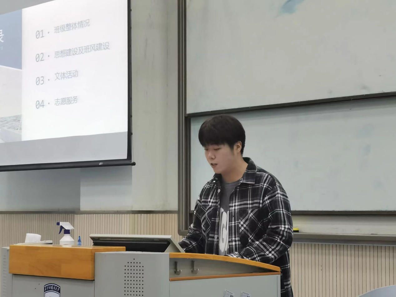 会上,2202班和2208班对本班年度工作和班级建设情况进行了展示。2202班班长赵莹从班级简历、党团建设、学风建设、班风建设以及未来展望五个部分着重展示了2202班向下扎根、向阳生长的良好班貌和相互学习、共同进步的浓厚学风。2208班班长吴世桥用记录班级日常的视频进行导入,从班级整体情况、思想建设及班风建设、文体活动,志愿服务四方面具体划分,将一个步履不停,追逐梦想的2208班展现了出来。两个先进班集体紧密团结、友爱互助,佳绩频出的精神面貌和工作态度为我们做出了表率。优秀的集体离不开优秀的个人,自2022年9月入学以来,2022级全体同学在专业学习、校园活动、志愿服务、社会实践、专业竞赛等各方面都涌现出优秀的榜样。此次会上张雪洁、肖羽桐等五名优秀学生代表发言交流,分享经验。