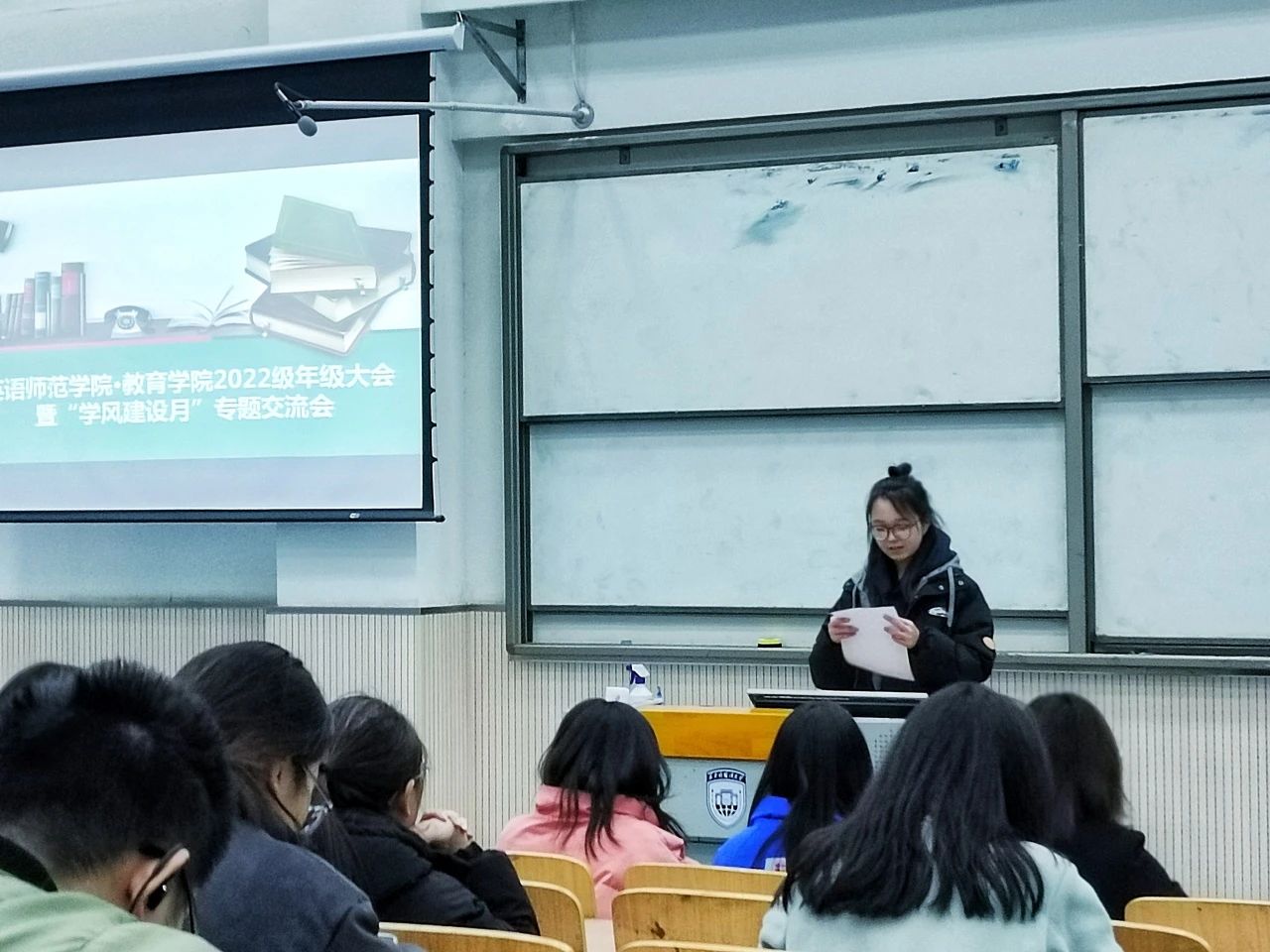 2022级于SD307召开年级大会暨“学风建设月”专题交流会。辅导员李瑞静和2022级全体学生共同参加了此次会议,会议由张梦格主持。