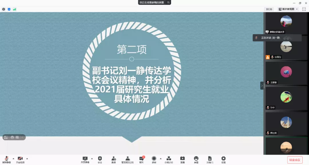 随后,副书记刘一静传达学校会议精神并详细分析了2021届研究生就业的具体情况。刘一静副书记指出针对有就业意向但还未签约的同学,导师应及时与学生进行沟通,给予学生帮助;对于未落实就业单位的同学,导师应帮助学生转变就业观念,引导学生先就业再择业。同时,为促进学生更好的就业,学院实行毕业生就业双导师制,每位导师都有一位学院领导班子联系人,多方齐抓共管,促进学生更高质量就业。