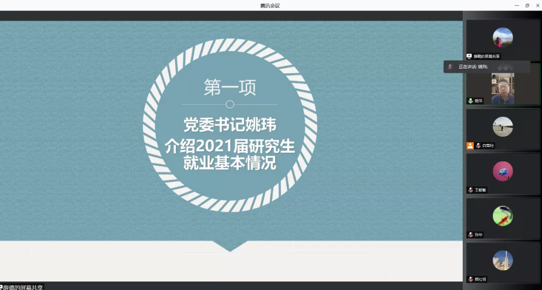 会上,姚玮书记就今年研究生就业的基本情况和2021届研究生导师所带研究生的去向落实率情况进行了分析,并希望各位导师了解学生的就业意愿,关心学生的就业去向,有目的、有计划、精准的提供相关就业指导。通过学生、导师、学校多方合力共同为学生就业保驾护航,帮助学生早日找到满意的工作。