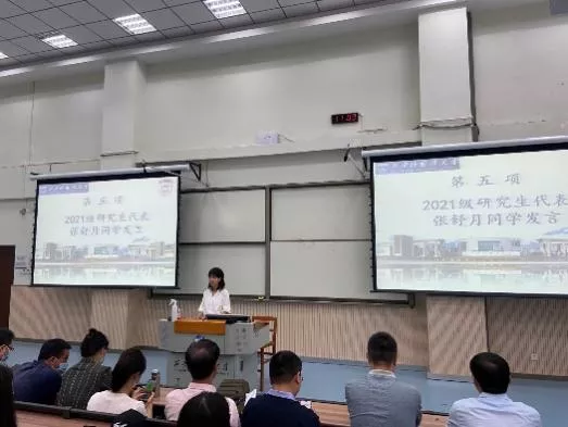 2021级研究生学生代表张舒月从学校建设、学习生活两个方面与同学们共勉,期待大家可以利用好学校的资源,努力拓展知识面,发挥特长,不断锻炼提升自我,在英师遇到更好的自己!