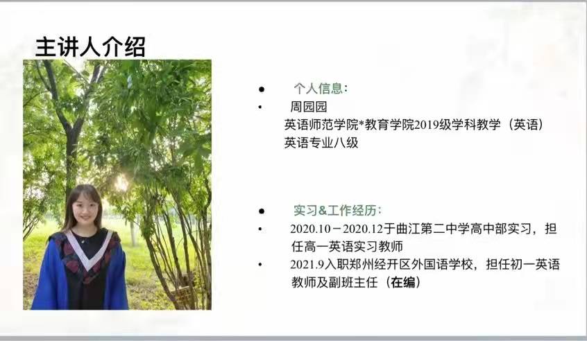 研究生做好职业规划和求职准备,学院特别邀请了2019级学科教学(英语)专业优秀毕业生周园园于12月11日10:00线上开展求职经验分享会。本次分享会由研究生辅导员薛璐主持,全体研究生参加。