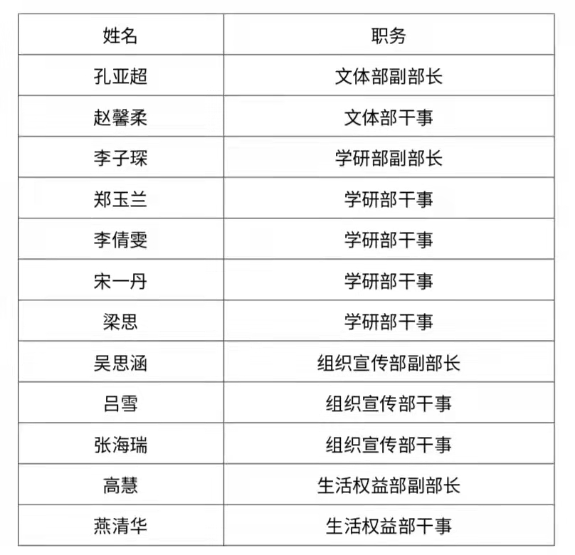 在尊重个人意愿、公平公正的前提下,经研究生会指导老师、主席团成员综合评议,现将英语师范学院·鸭奈飞 2022-2023学年第一学期研究生会纳新名单公示如下: