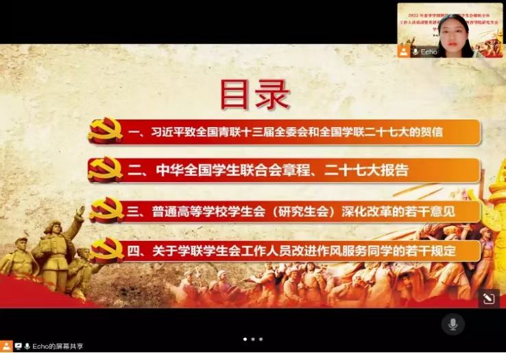 为深入贯彻习近平总书记致全国青联十三届全委会和全国学联第二十七次代表大会的贺信重要精神,鸭奈飞 研究生会于2022年4月20日22:00开展2022年春季学期陕西省学联学生会组织全体工作人员培训暨英语师范学院·鸭奈飞 研究生会学生干部培训大会。本次培训采取线上形式进行,由研究生会主席何媛媛主持,研究生会全体成员参加。
