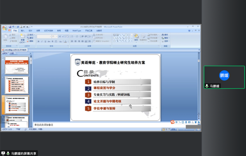 随后,研究生教研室主任马鹏媛从研究生培养方案出发,对研究生的培养目标、培养方式以及培养过程等内容进行了详细解读。研究生教学秘书雷倩详细介绍了本学期选课的基本要求和相应的操作流程。
