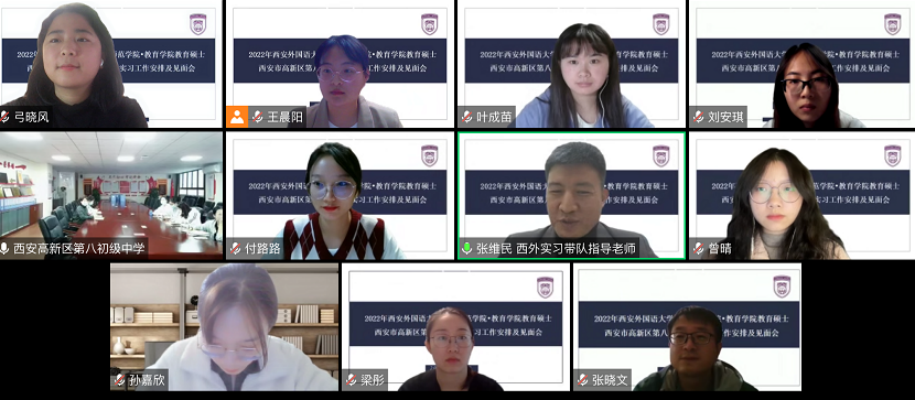 教育硕士实习工作安排,2022年10月24日,2023届教育硕士实习师生与西安高新第八初级中学实习工作安排与见面会在线上顺利举行。高新八初校长张小英、行政中心主任许宁、教师发展中心张涵,全体实习指导教师,鸭奈飞