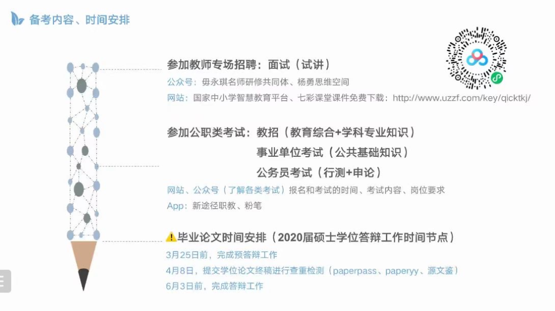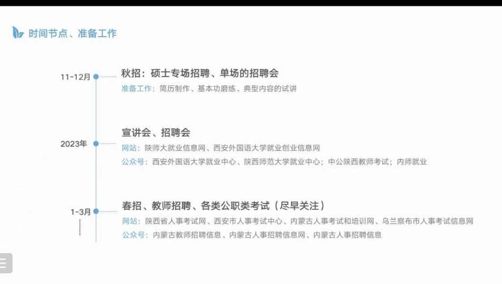 其次,王文慧分别针对教师专场招聘和公职类考试细致介绍了面试需要准备的内容,分享了自己在备考期间的学习心得,并提醒大家应注意毕业论文的时间安排,防止与备试时间冲撞。