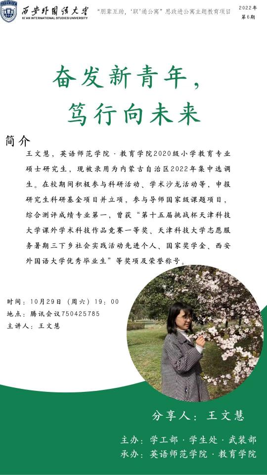 毕业生求职,学院特别邀请了2022届小学教育专业优秀毕业生王文慧于10月29日19:00通过腾讯会议分享就业经验及求职历程。此次分享会为“朋辈互助,职通公寓”思政进公寓主题教育项目2022年第6期活动。会议由院研究生会生活权益部李姣姣主持,全体研究生参加。