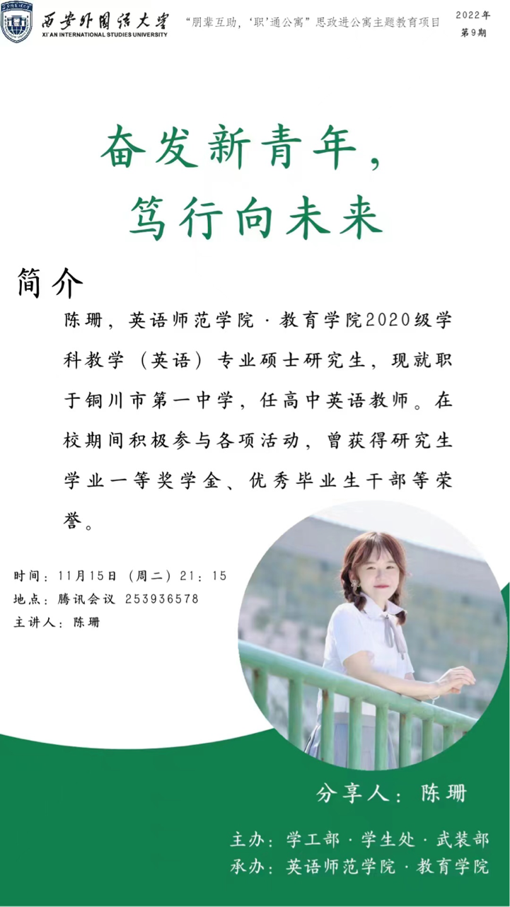 研究生做好职业规划和求职准备,学院特别邀请了2022届学科教学(英语)专业毕业生陈珊于11月15日21:15通过腾讯会议分享就业经验及求职历程。此次分享会为“朋辈互助,职通公寓”思政进公寓主题教育项目2022年第9期活动。会议由院研究生会生活权益部宋一丹主持,全体研究生参加。