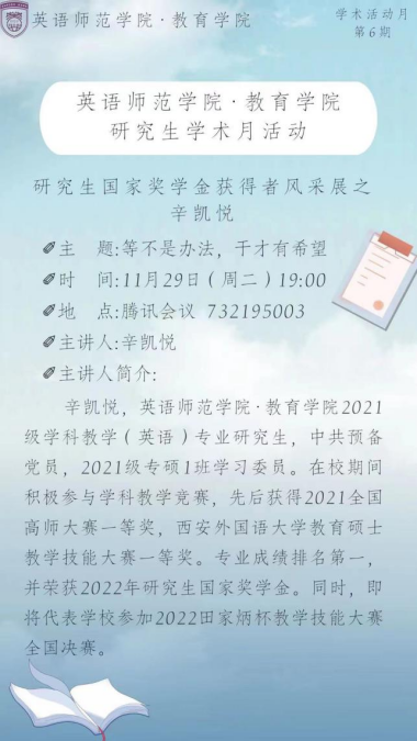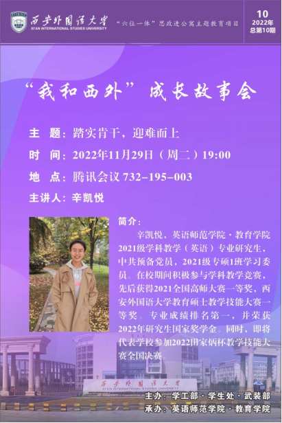 “六位一体”思政进公寓主题教育重点项目:“我和西外”成长故事会——校史文化进公寓实践项目系列活动(第十期)在线上成功举行。本次分享会也是研究生学术活动月第6期活动,此次活动主讲人为2022年研究生国家奖学金获得者辛凯悦。本次会议由院研究生会学研部蓝恬主持,学院各年级学生参会。
