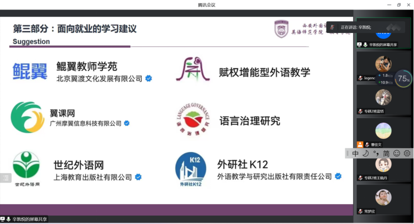 此次分享会的主题为“踏实肯干 迎难而上”。首先,辛凯悦结合自身参赛经历,向大家细致讲解了高师赛、田家炳教学技能大赛、模拟授课大赛、研究生教学竞赛的注意事项以及个人的比赛心得。她提醒同学们,要深度理解新课程标准,明确教学方向,熟悉各主流版本教材的编写框架,注重开口练习,广泛听取不同听众的意见,通过录制视频的方式纠正体态问题。
