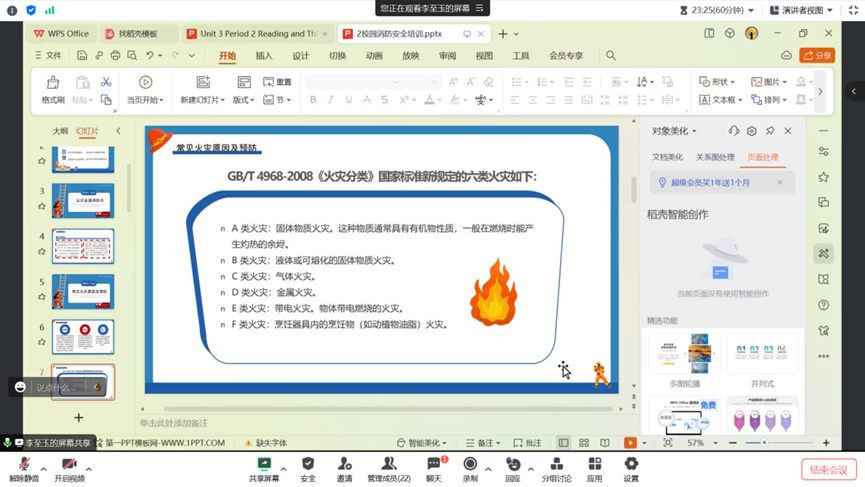 首先,各班主持人通过引入一则西安一高校发生火灾的例子,引出今日班会主题,并从四个部分展开班会内容。第一部分为对火灾的基本了解,第二部分为校园及宿舍的消防安全,第三部分是灭火器的使用方法,第四部分是遇到火灾时的自救方法。