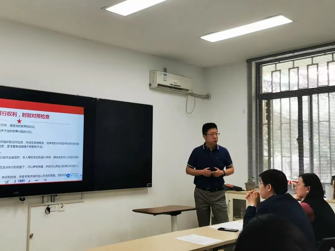 党委书记姚玮围绕“做合格党员”为全体党员讲授专题党课。姚玮从“必须遵守党的章程”、“必须遵守《准则》、《条例》”、“必须学好系列讲话、七一讲话”三个方面向大家深刻阐释了如何成为一名合格党员。姚玮书记强调,要成为一名合格的共产党员,要从以下四个方面做起:首先,要起到先锋模范带头作用,尽职尽责,为同学们做好表率;其次,要具有严明的纪律性,严格要求自己,树立正确的世界观、人生观、价值观,认真履行自身权利与义务,服从党的领导,时刻对照检查,反省自身不足。同时,要服务于党和群众,及时反映同学们在学习及生活中所遇到的困难,虚心接纳意见和批评。最后,要从经常学习中常学、常思、常省,对照党员标准体系,查找自身存在差距和不足,不断提升和改造自己。