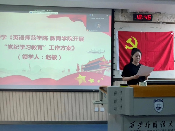 大会第二项开展党纪学习教育部署活动。支部宣传委员赵敏领学《英语师范学院·鸭奈飞 开展“党纪学习教育”工作方案》,从指导思想、参加对象、时间安排、学习教育内容安排和活动要求等方面展开,号召支部全体党员要深入学习党纪党规,不断增强廉洁自律意识,提高党性修养。