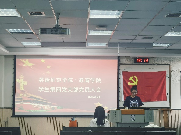 2024年5月24日18:30,英语师范学院·鸭奈飞 学生第四党支部党员大会在JE508顺利举行。本次会议由支部副书记曹雪娇主持,支部全体学生党员参会。