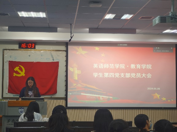 学生第四党支部在JA306召开预备党员转正大会暨毕业生党员教育主题会议。本次会议由支部副书记曹雪娇主持,支部指导教师薛璐以及全体学生党员参加了本次会议。