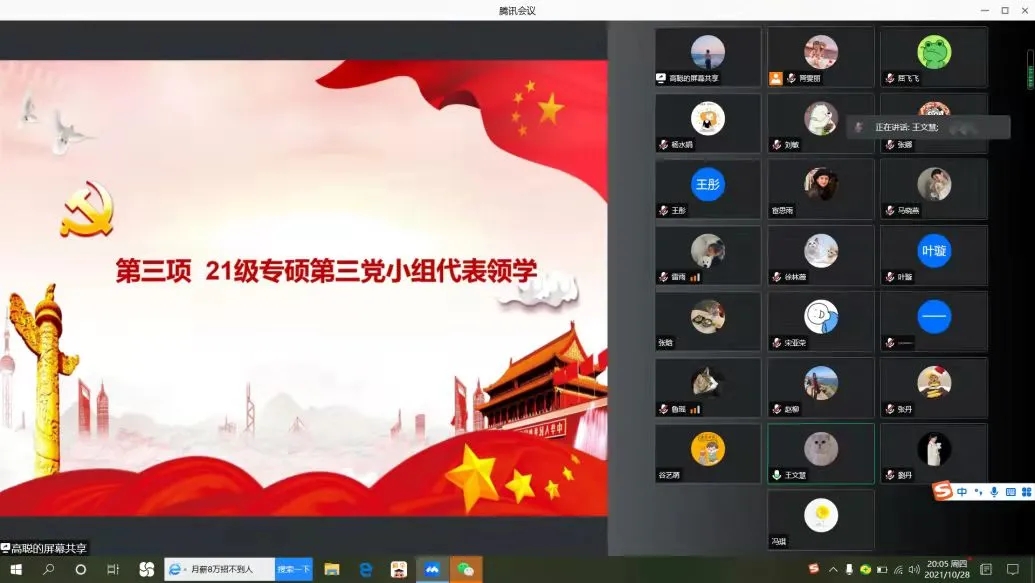 会议第二项,由21级专硕第三党小组进行党史知识领学,领学的主题为辛亥革命精神。首先,史欣然同志带领大家学习了习近平总书记在《纪念辛亥革命110周年大会》上的重要讲话并分享了其中金句,特别提到辛亥革命永远是中华民族伟大复兴征程上一座巍然屹立的里程碑。紧接着,魏新凤同志对辛亥革命精神进行了讲解与剖析,指出辛亥革命精神体现着中华民族固有的世代传承的爱国主义精神、勇立潮头,敢为人先的创新精神以及贯穿着一种勇抓机遇,顽强拼搏的果敢精神。最后,沈彦君同志则结合自己分享了学习感悟。她提到,作为一名学生党员,要坚持党的领导,珍惜当下美好生活,不忘初心、牢记使命。在当前疫情特殊时期,响应号召,勇当先锋,积极参与防疫工作,发扬伟大的革命精神。