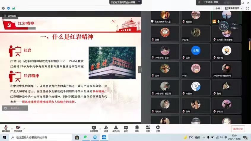 本次会议共有两项议程,一是“树起先进旗帜,亮明党员身份”主题党日活动;二是由21级第二党小组党员代表领学十九届六中全会精神及红岩精神。
