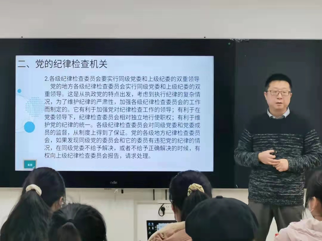 本次党课以党的纪律和纪律检查机构为主题,姚玮书记首先强调了学习党的纪律的必要性和重要性。姚书记讲道,作为一名党员,一定要加深对党的知识的了解,特别是要熟知党章的基本内容,要知晓党章中约束党员的基本规范是什么。党的纪律不仅要求党员哪些不能做,还告诉了党员应该怎么做,以此保证了党组织的先进性和纯洁性。党的十九届六中全会深入研究党加强自身建设、推进自我革命的百年历程,把“坚持自我革命”概括为党百年奋斗的十条历史经验之一,而党的纪律就是党坚持自我革命、自我完善的原则。因此,所有党员必须知晓党纪,遵守党纪,并将其内化于心,外化于行。